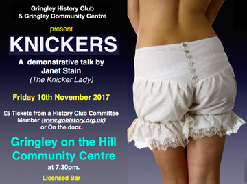 By kind arrangement of Peter Young, Janet presented her History of Knickers to a gathering in the Community Centre on Friday evening. From her exhaustive supply of samples in a never ending suitcase she produced pair after pair of drawers, bloomers, and knickers of nearly every material and hue. This was accompanied by amusing and informative comment, and a fun time was had by all.